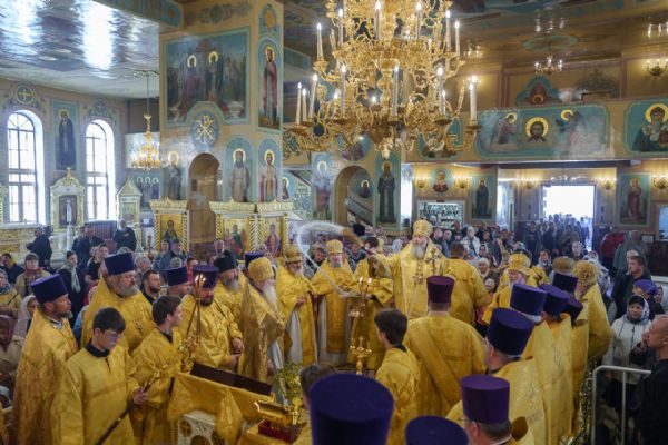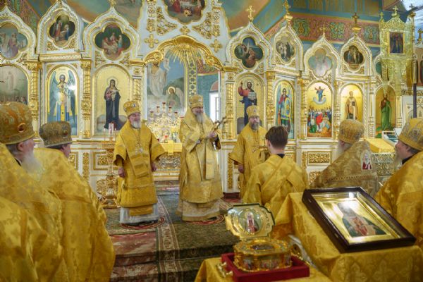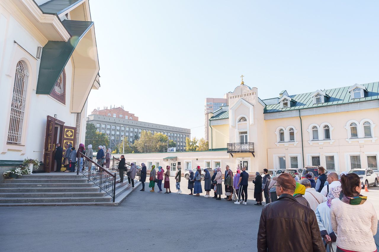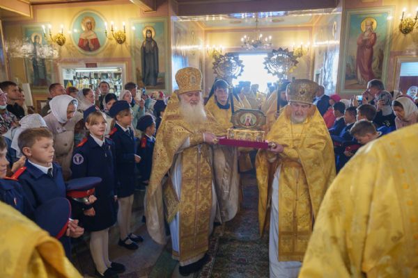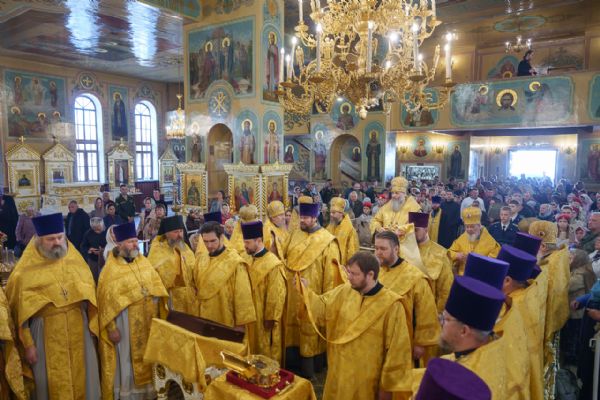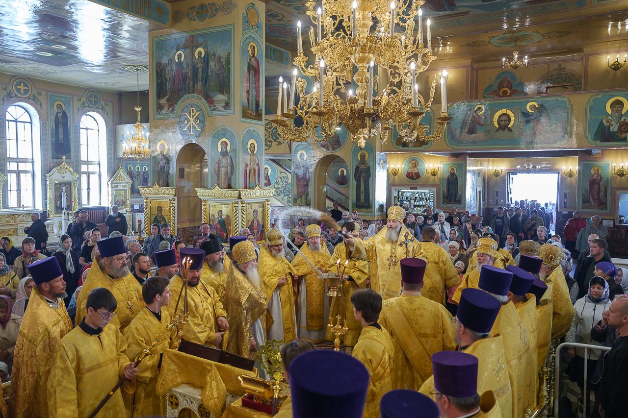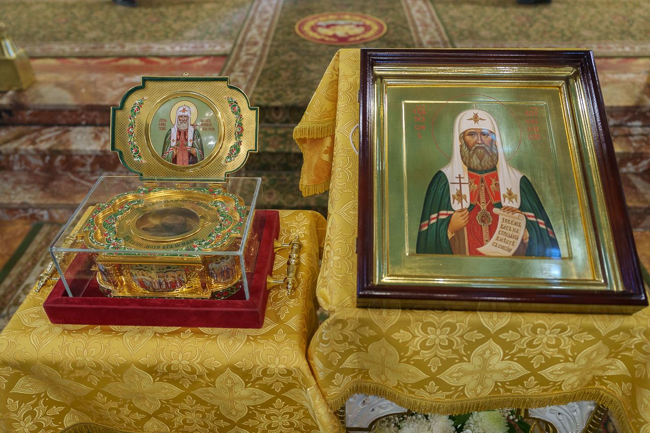 С пением величания святителю Тихону ковчег с частицей мощей и икону святого внесли в храм, установив в центре. Затем была совершена Божественная литургия. Богослужение возглавил митрополит Новосибирский и Бердский Никодим. Высокопреосвященнейшему владыке сослужили епископ Искитимский и Черепановский Леонид, епископ Каинский и Барабинский Владимир, духовенство Новосибирской епархии. В сугубую ектению были включены особые прошения о единении, затем архиерей прочитал молитву о Святой Руси.