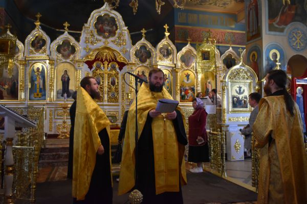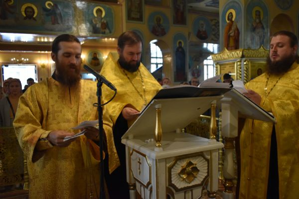 Служение молебна перед мощами святителя возглавил настоятель Знаменского храма иерей Игорь Непша, ему сослужили настоятель Георгиевского храма иерей Александр Сахненко и клирик Знаменского храма диакон Максим Владимиров. Богослужебные песнопения исполнил малый состав Праздничного ансамбля Георгиевского храма. Прихожане Георгиевского храма участвовали в богослужении, следя за его ходом и припевая припевы акафиста.