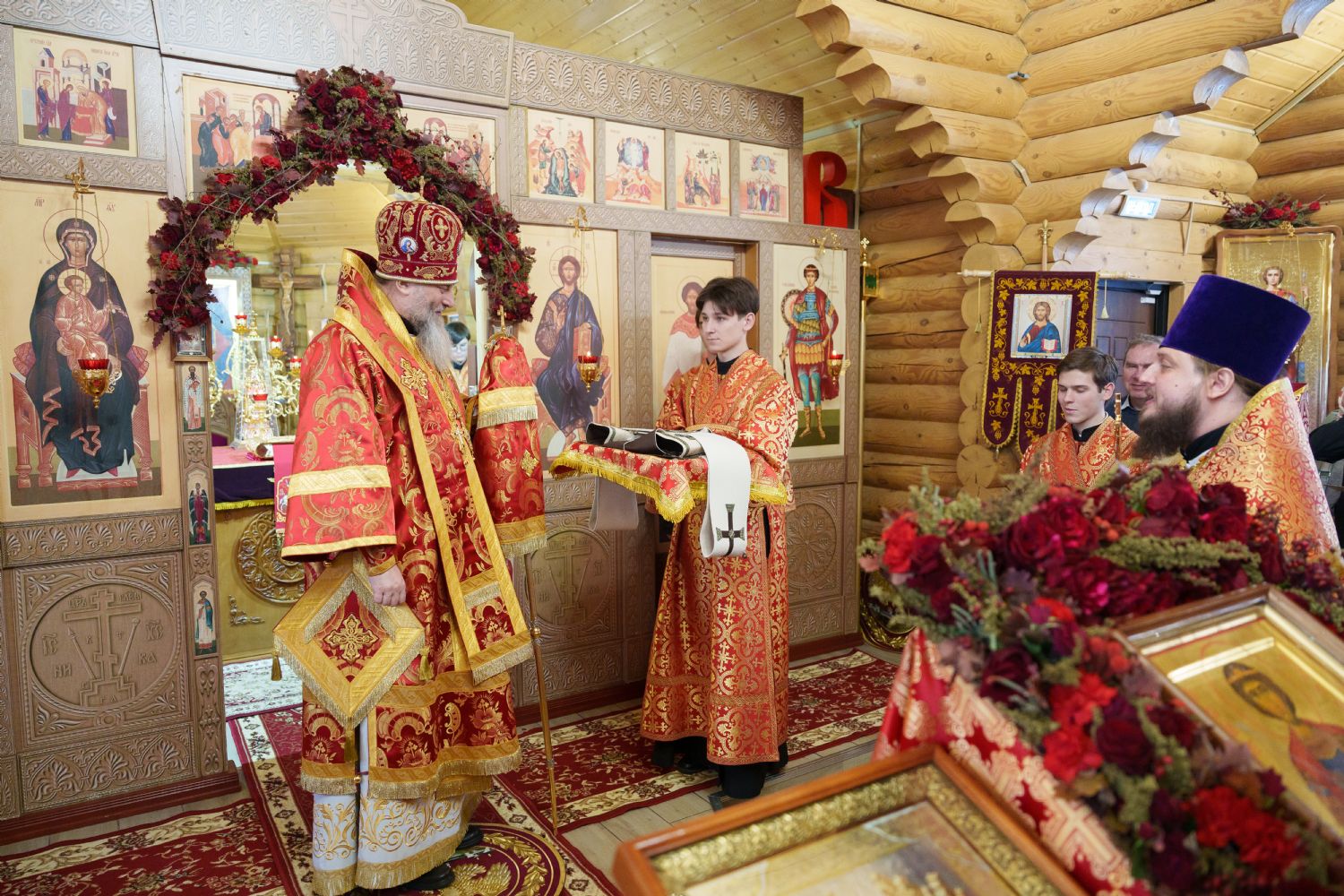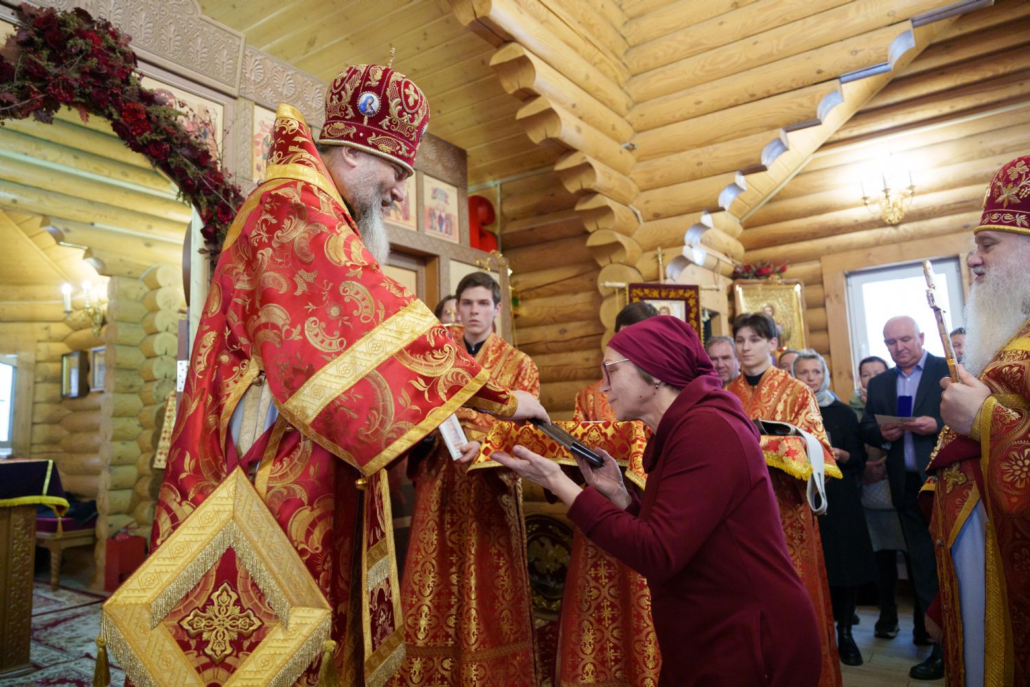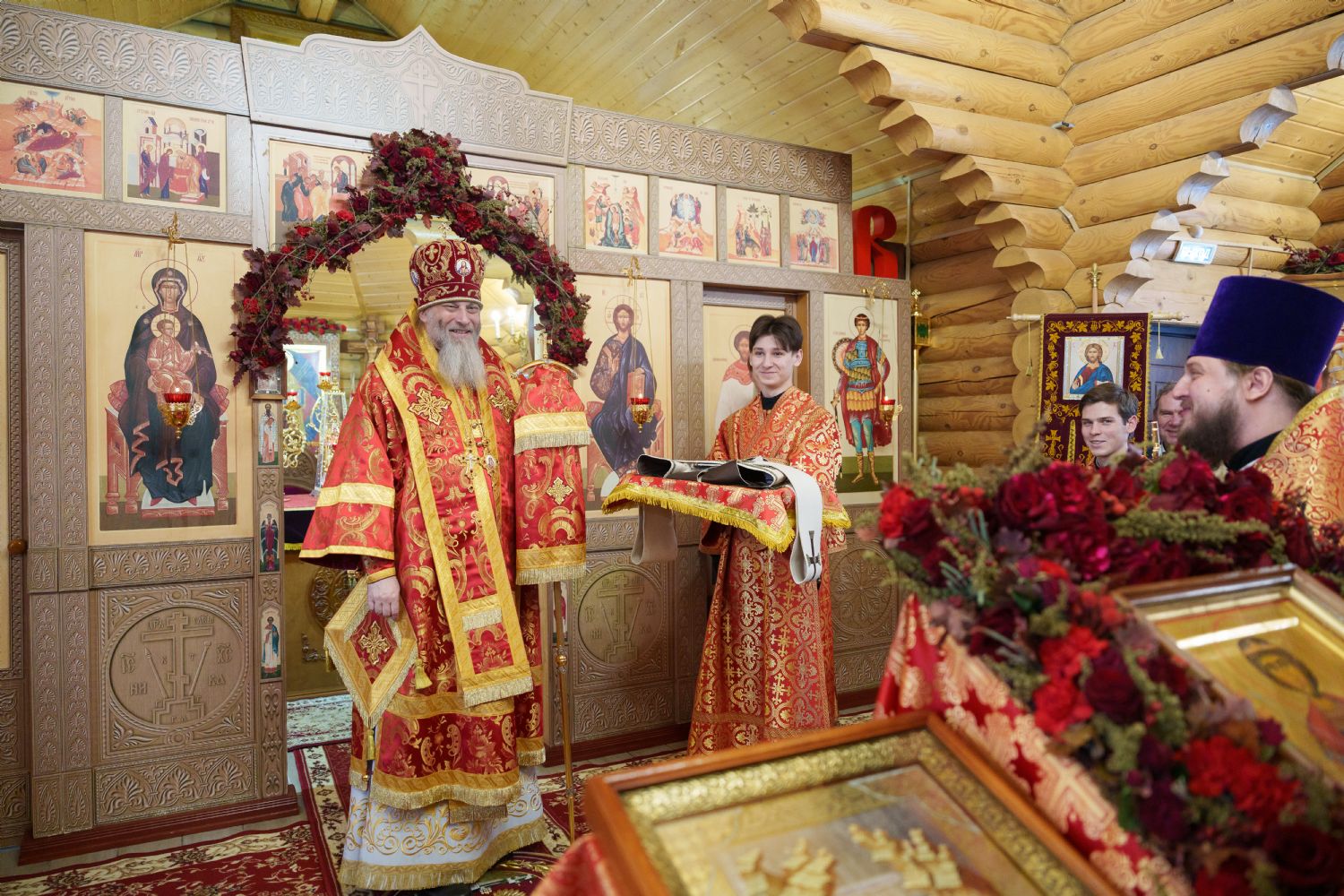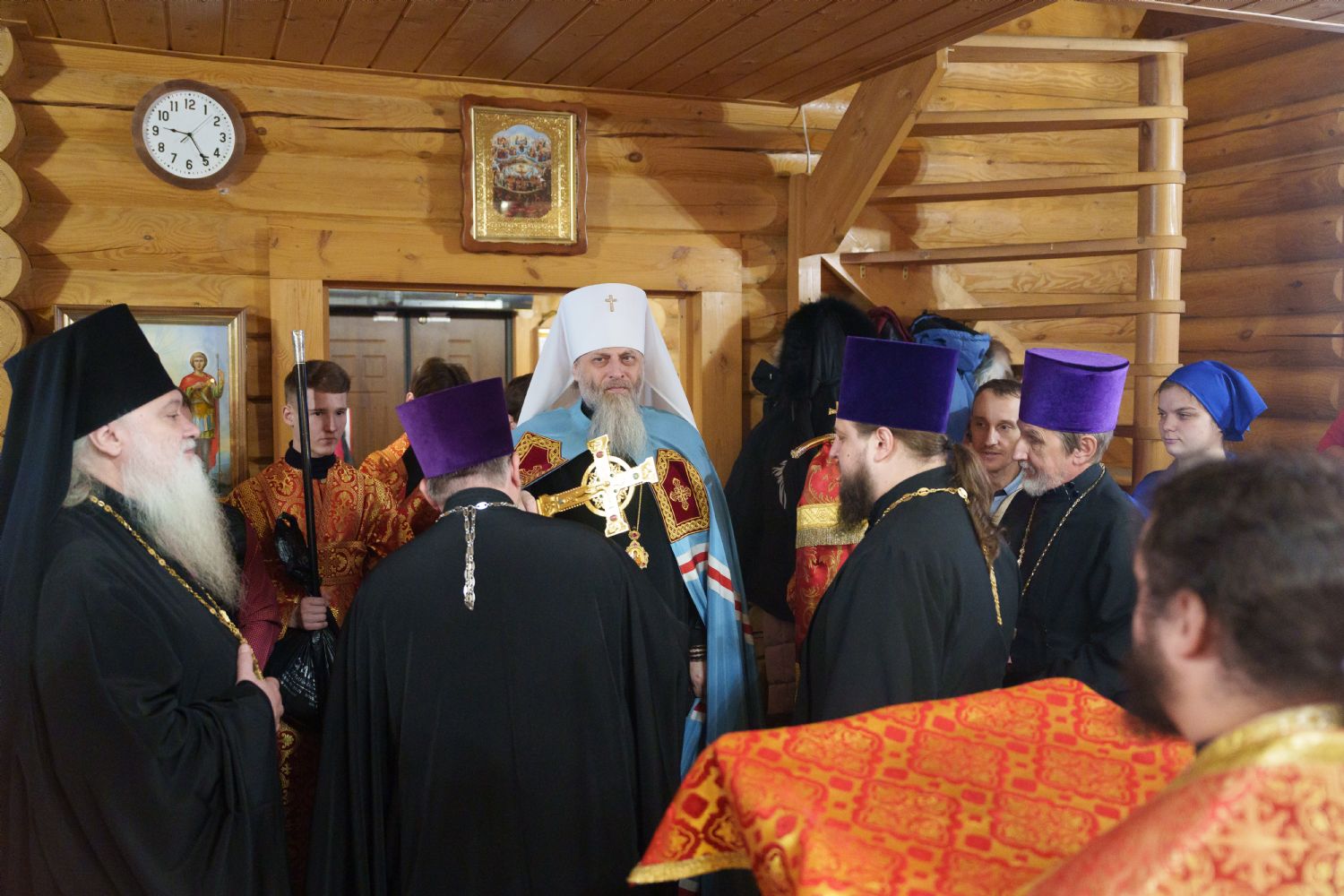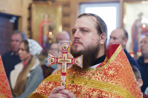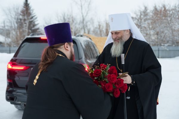 Затем с ответным словом к Владыке обратился настоятель Прихода иерей Александр Сахненко, который от лица Прихода приветствовал митрополита Никодима в построенном его личным попечением святом храме и преподнес Его Высокопреосвященству на долгую молитвенную память малое архиерейское облачение, пошитое с любовью профессионалами церковного швейного мастерства из природных материалов по древним традициям с использованим современных технологий. Особенностью облачения стал вручную сотканный из шерсти ягнёнка малый архиерейский омофор.