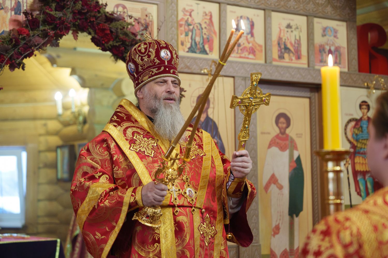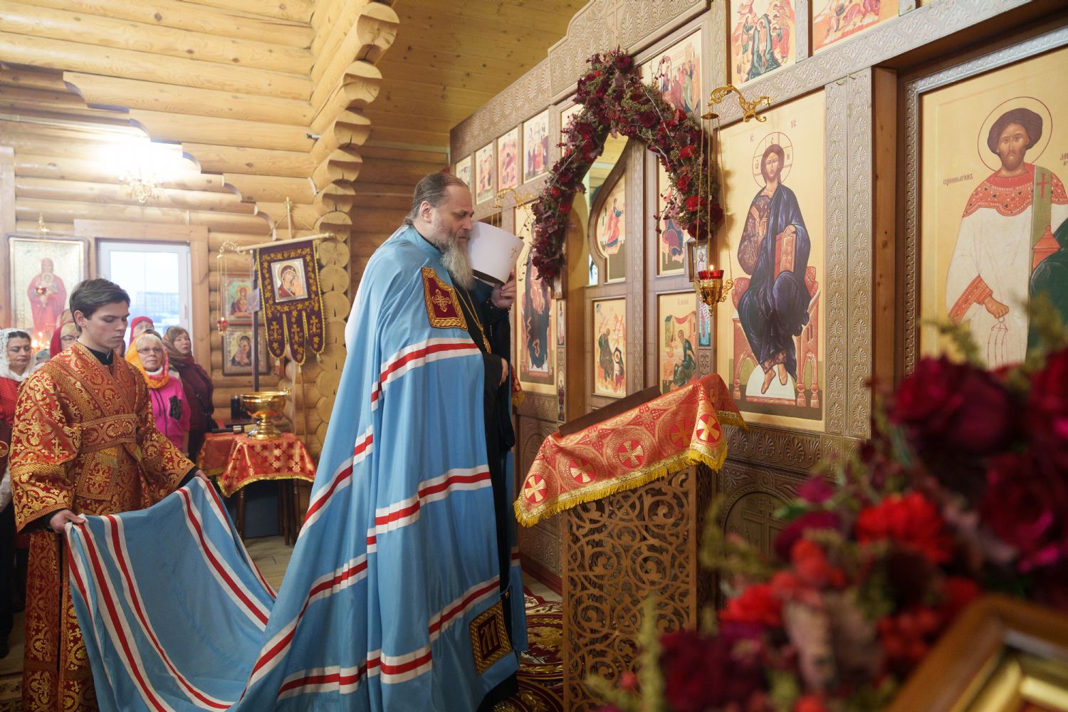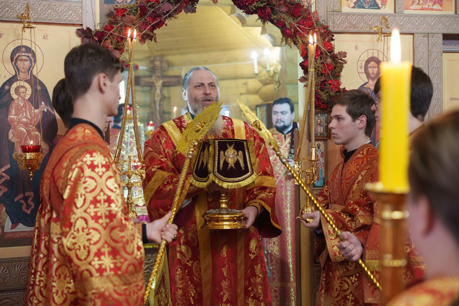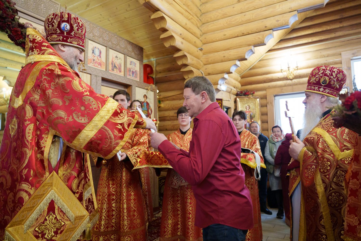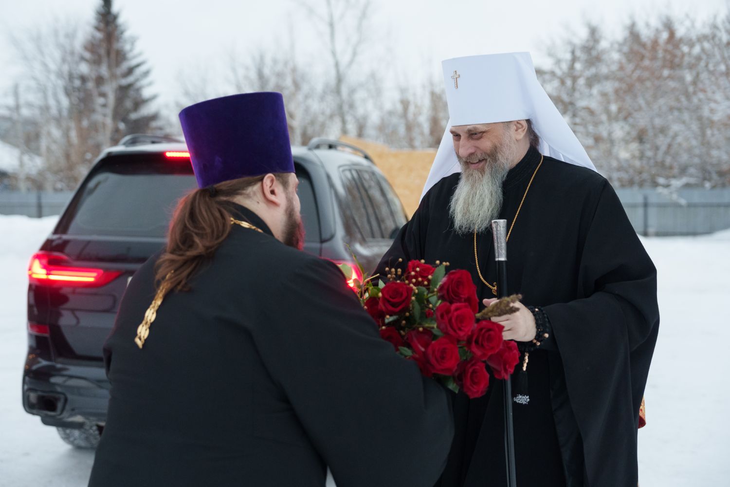 Затем с ответным словом к Владыке обратился настоятель Прихода иерей Александр Сахненко, который от лица Прихода приветствовал митрополита Никодима в построенном его личным попечением святом храме и преподнес Его Высокопреосвященству на долгую молитвенную память малое архиерейское облачение, пошитое с любовью профессионалами церковного швейного мастерства из природных материалов по древним традициям с использованим современных технологий. Особенностью облачения стал вручную сотканный из шерсти ягнёнка малый архиерейский омофор.