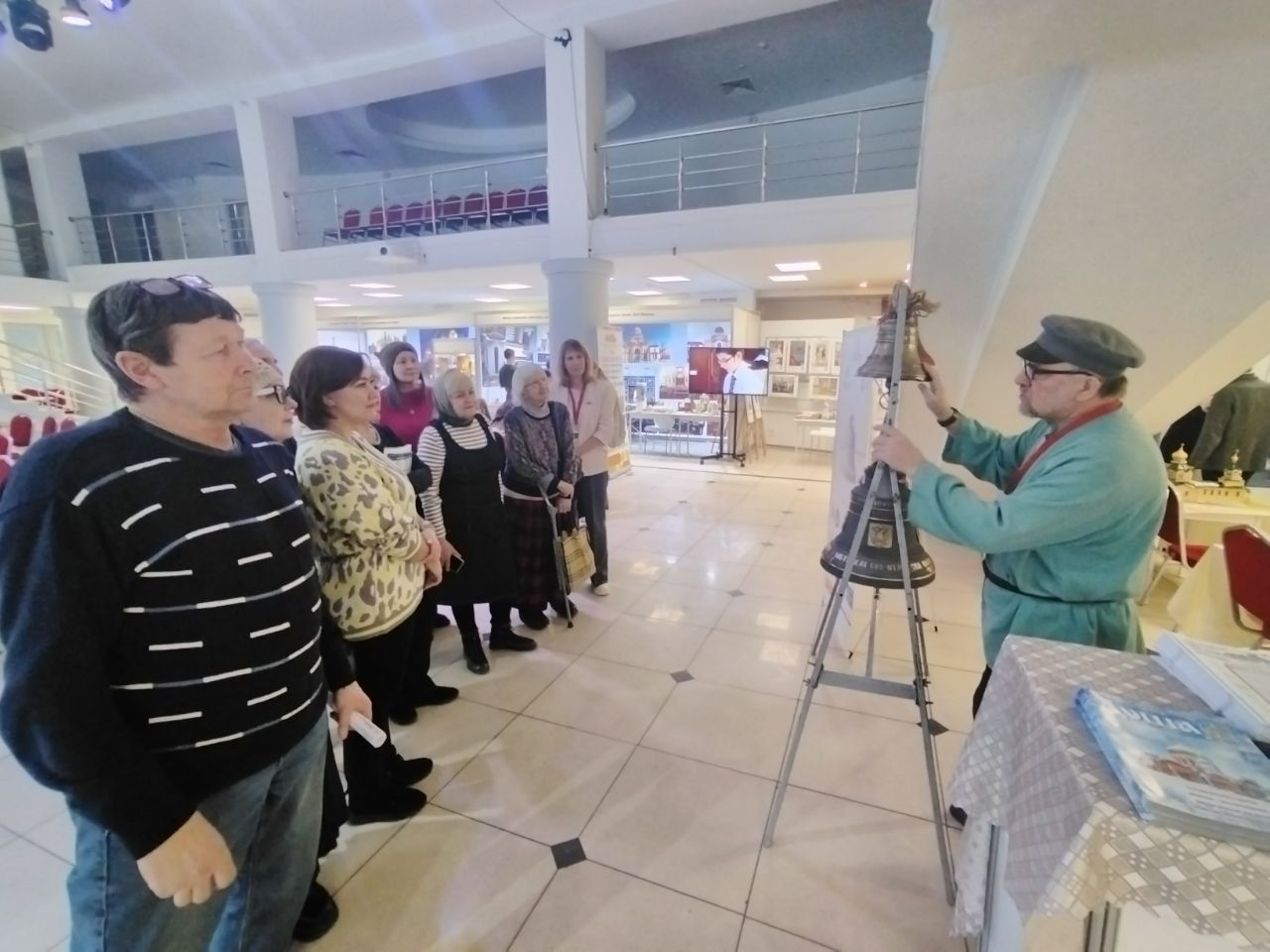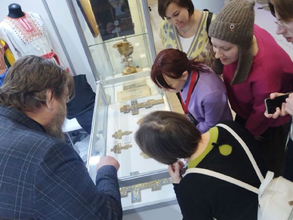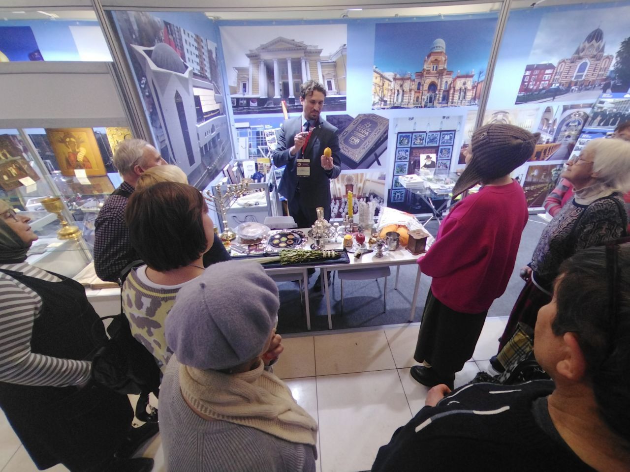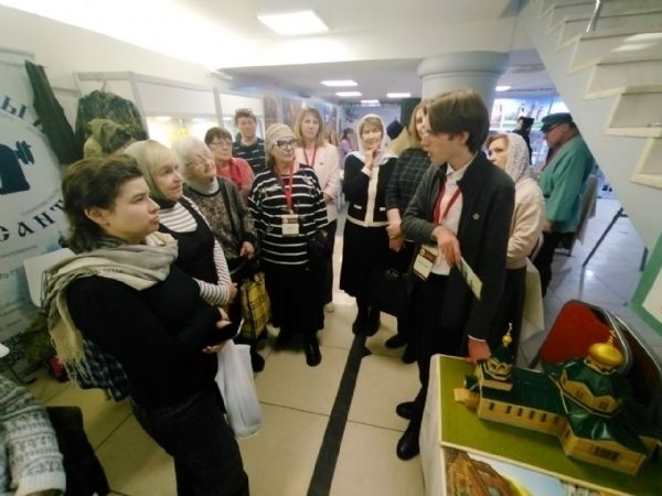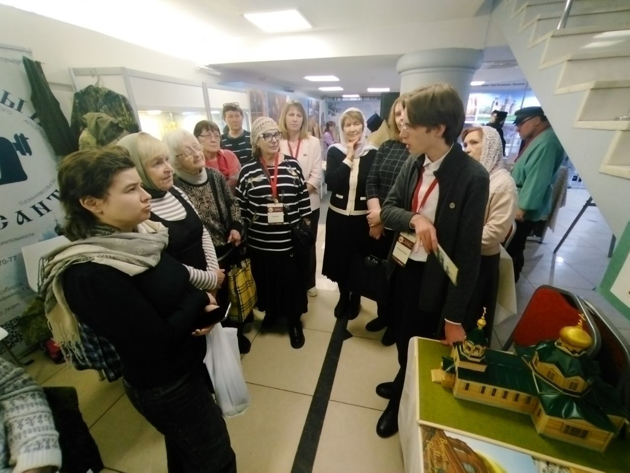 Небольшая экскурсионная группа посетила по очереди все экспозиции, представленные на выставке. Первым был стенд Православной Церкви, где иерей Александр Сахненко, настоятель Георгиевского храма и помощник Управляющего Новосибирской епархией по представительским вопросам подробно рассказал об экспонатах, предложенным зрителям. Отец Александр представил братьям и сёстрам древнюю и современную церковную утварь, облачения, иконы и книги. С основами иконописи познакомила экскурсантов иконописица Прихода, методист и преподаватель иконописного отделения Свято-Макарьевского центра подготовки церковных специалистов Алевтина Иннокентьевна Бухгольц. Иконописица подробно рассказала о материалах, используемых для приготовления темперных красов, подготовки специальной доски для будущей иконе, продемонстрировала процесс роскраши и перенесения на икону сусального золота. Ещё долго расспрашивали Алевтину о различных материалах, способах работы и прочих интересных подробностях из неизведанного мира церковного искусства. С историей разрушенных храмов Новосибирска, их макетами и реконструированной виртуальной реальностью познакомил собравшихся пономарь приписного храма Петра и Февронии Муромских пос. Озёрный Федор Елисеенко, учащийся Лицея №22 "Надежда Сибири". О своей деятельности подробно рассказали швейные мастерские при храмах святого преподобного Олега Брянского и святого апостола Андрея Первозванного, а также Сибирский центр колокольного искусства. У каждого желающего была возможность позвонить самим в колокола.