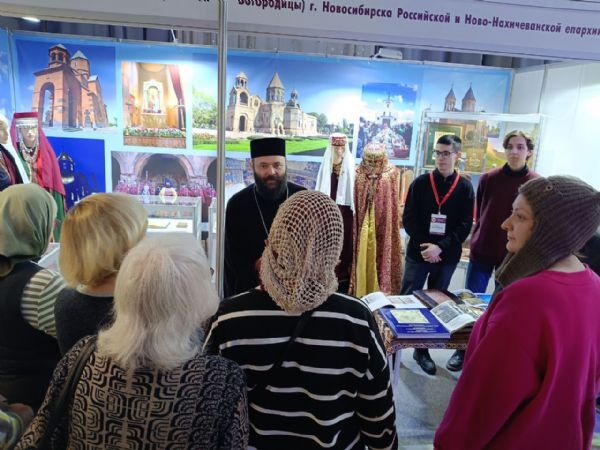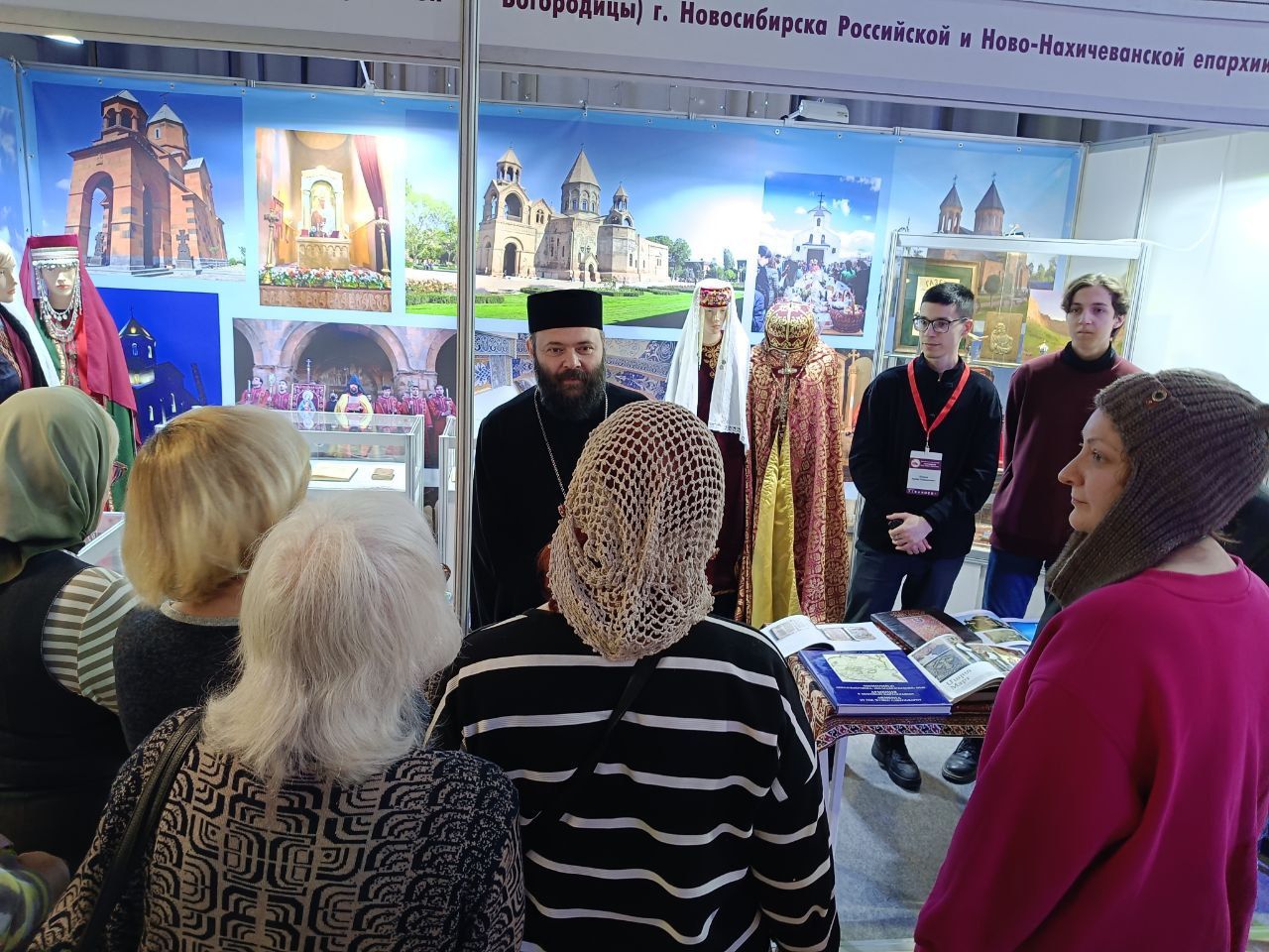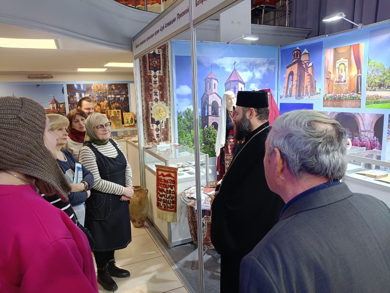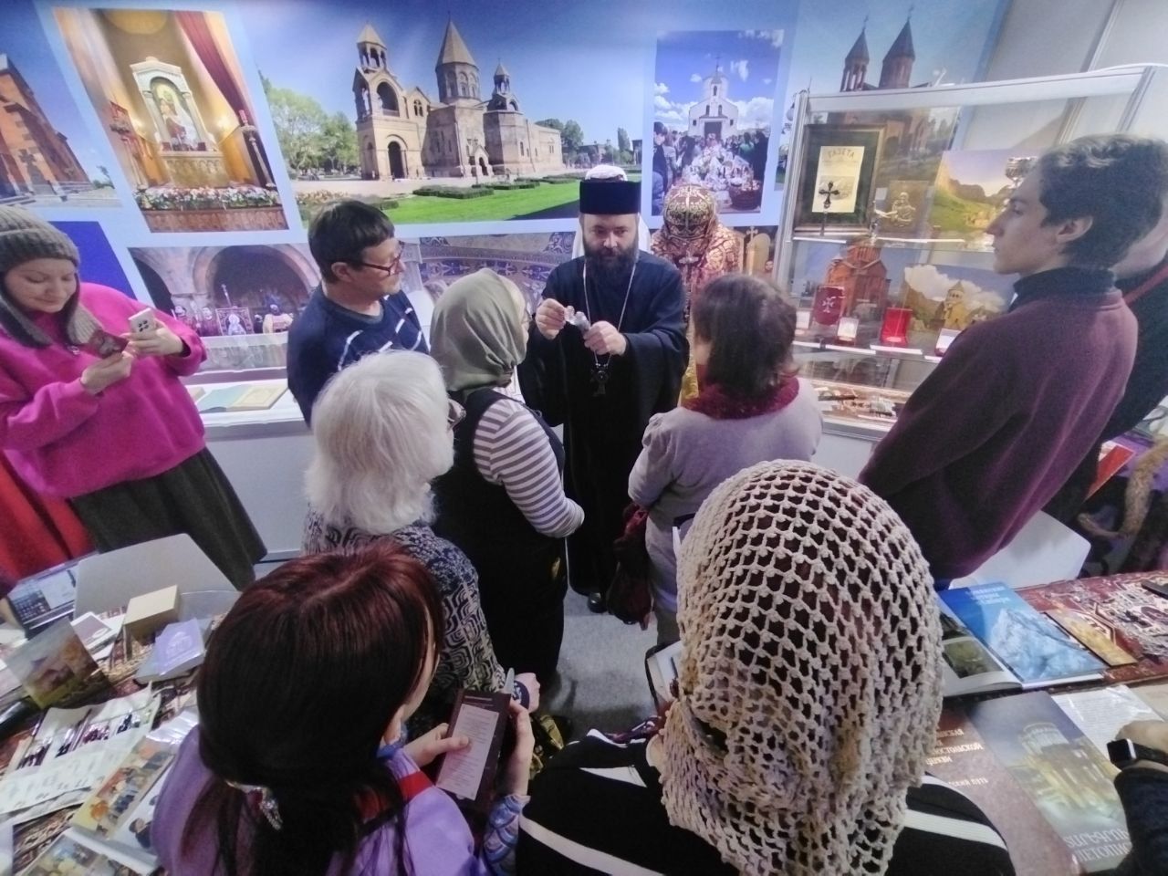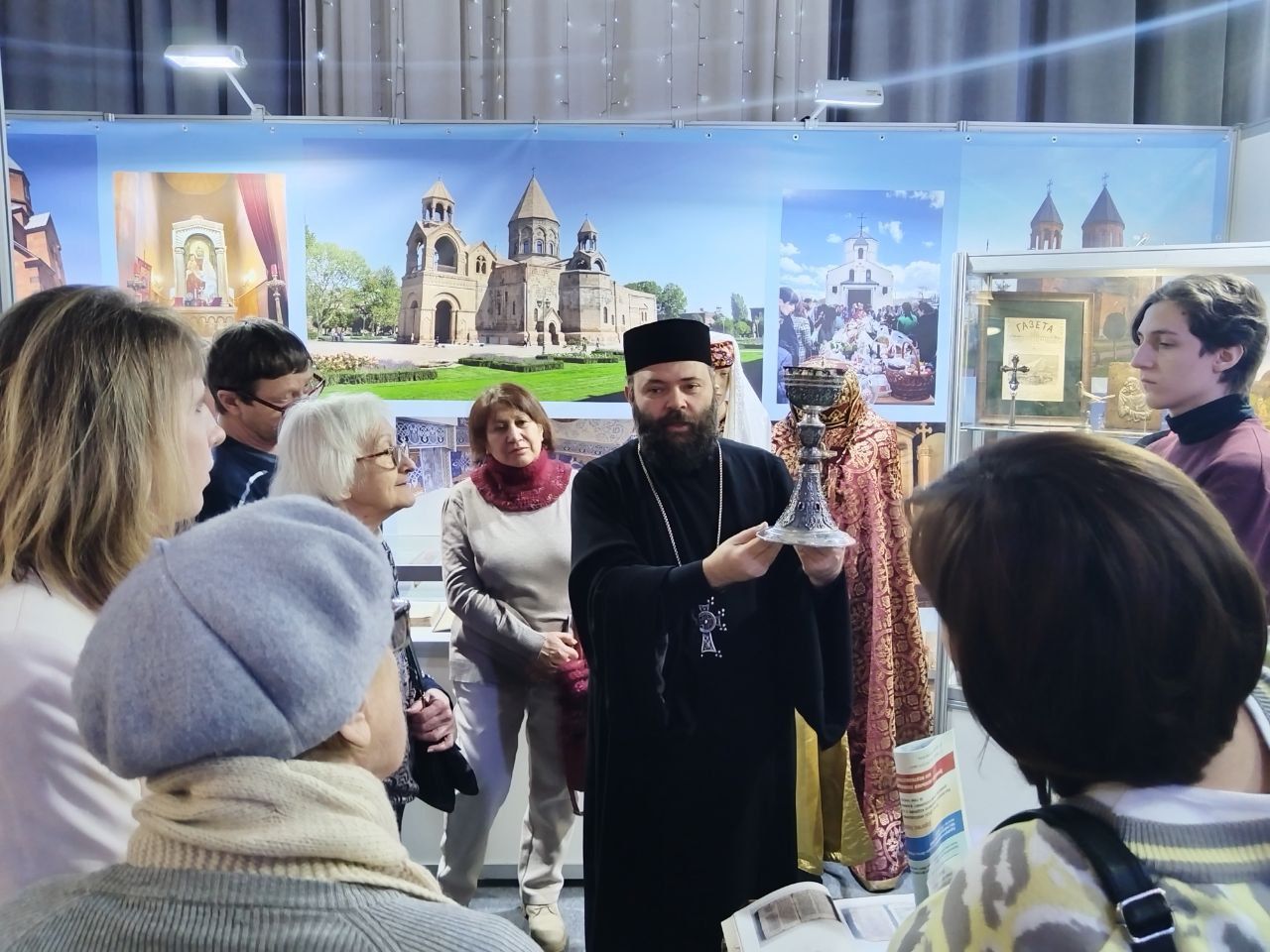 На стенде Армянской Апостольской Церкви прихожан Георгиевского храма встречал иерей Григор Бекназарян, настоятель храма "Сурб Аствацацин" (Пресвятой Богородицы) г. Новосибирска Российской и Ново-Нахичеванской епархии. Отец Григор показал представленные на витринах стенда книги об армянской культуре и традициях, показал привезённые специально для выставки интересности и древности — священническое облачение, ручной богослужебный крест, ручку в виде креста от котла для мироварения, миниатюрные хачкары, сосуд для мира в виде голубя, богато украшенный серебрянный Потир для Причащения, богослужебное евангелие. Рассказ армянского батюшки преизобиловал ссылками на Священное Писание, притчами и живыми примерами, а ответы на вопросы были настоящими и искренними.