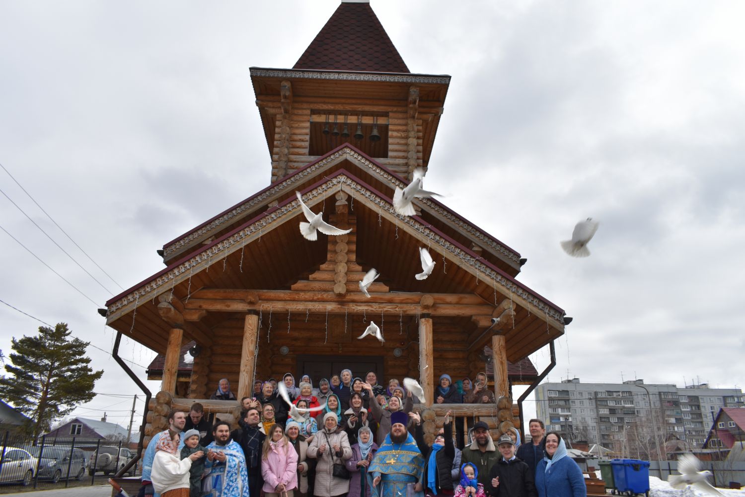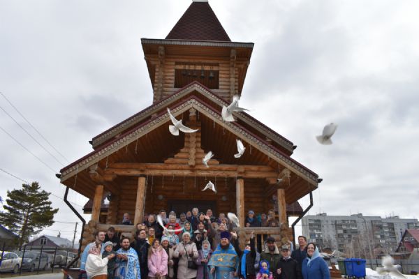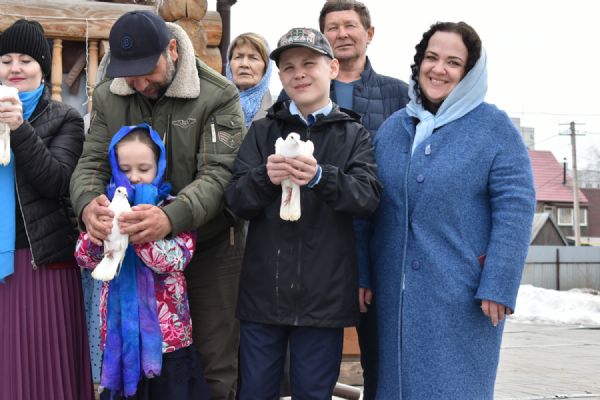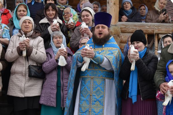 По традиции после богослужения в праздник Благовещения духовенство храма вместе с участниками богослужения выпустили в небо белых голубей.
